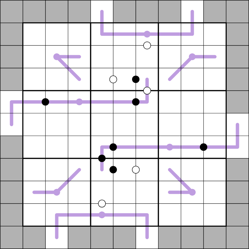 Zipper Line: A lavender line has equal sums on pairs of cells equidistant to the center (indicated by a lavender circle); if the center is also the center of a cell, then that center equals the sum of pairs.