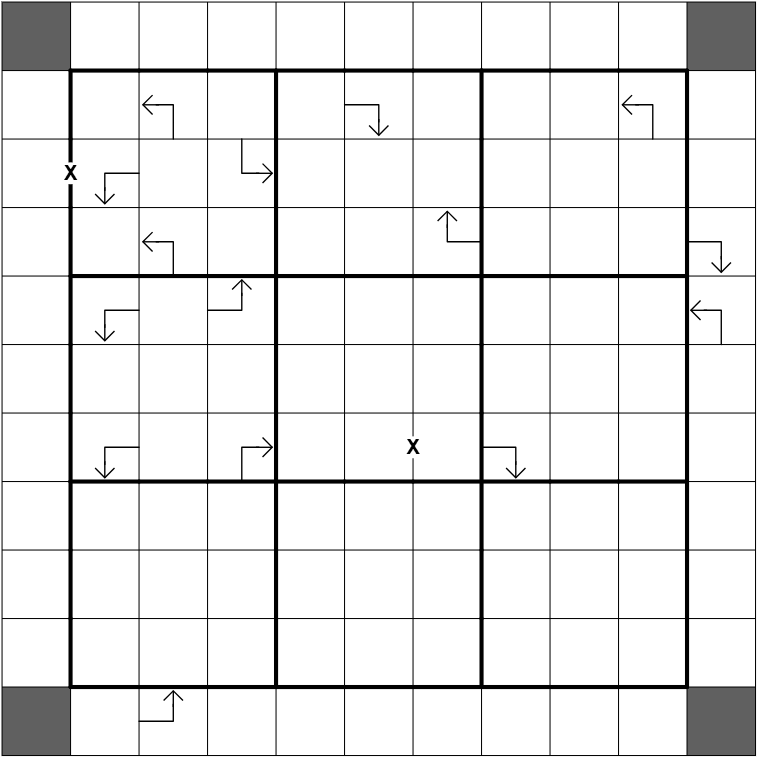 - Slingshot: If a bent arrow is present in a cell, the digit in the cell the arrow comes from appears in the grid in the direction of the arrow at a distance of N cells, where N is the digit in the arrow's cell