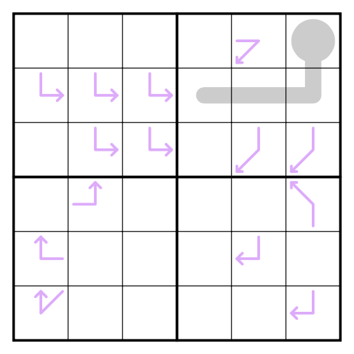 - Slingshots: If a purple arrow is present in a cell, the digit in the cell the arrow comes from appears in the grid in the direction of the arrow at a distance of N cells, where N is the digit in the arrow’s cell.