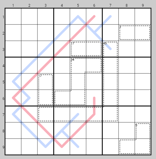 Killer Cages: Digits in cages must sum to the number in the top-left corner (if given) and cannot repeat. If a cage has no given total the cage must still sum to one of the given totals (3, 6, 17, 34, 45).