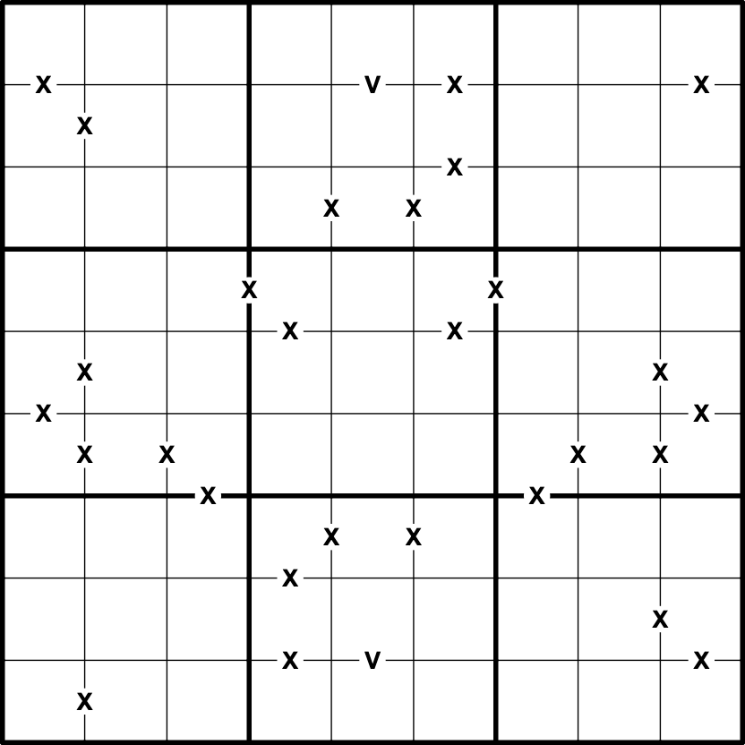 Knapp Daneben XV: An X connects two digits that sum to 9 or 11. A V connects two digits that sum to 4 or 6. Not all X's and V's are necessarily given.