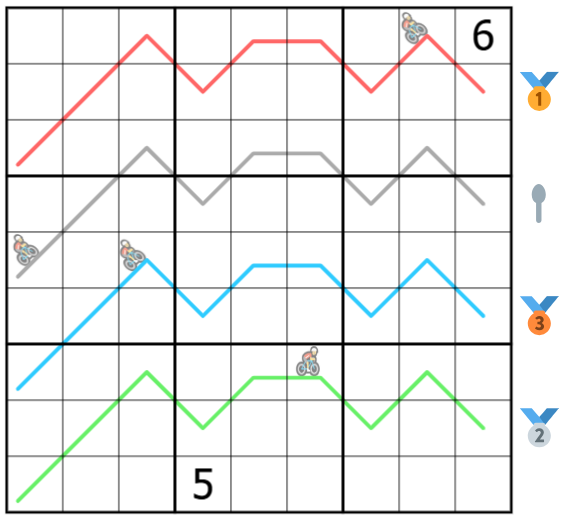 Digit in a cell with a rider indicates the amount of points earned by that rider.
