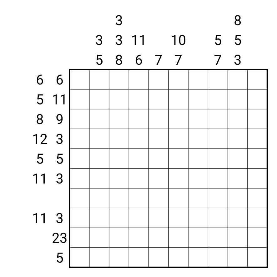 Assign each line shape (irrespective of rotation) a digit from 1 to 4 as follows: corner = 1, straight line = 2, branch = 3, cross = 4. Clues outside the grid indicate the sum of "digits" in each contiguous sequence of cells visited by the loop network, in the correct order. Consecutive sequences must be separated by at least one cell not visited by the loop network. For a given row or column, either all clues or no clues are given.