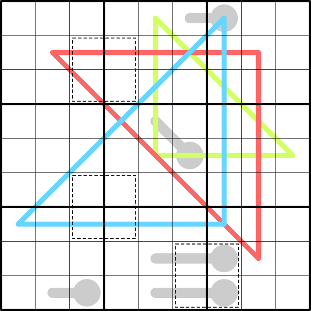 Triangles: The sum of the squares of the number of As on one leg (vertical or horizontal segment) and the number of Bs on the other leg must be equal to the square of the number of Cs on the hypotenuse (diagonal segment). In other words, the triangle must satisfy this equation: (As on one leg)2 + (Bs on other leg)2 = (Cs on hypotenuse)2. Each value in parentheses must be greater than 0.