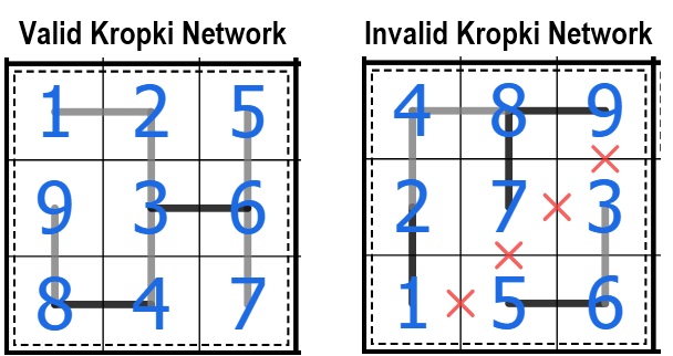 Kropki Networks : orthogonally adjacent cells are considered 'linked' if their digits are consecutive or in a 1:2 ratio. Within each caged 'kropki network', all cells be must linked, and all links must form exactly one connected group (example below). Cells in a kropki network may link to cells that are not in a network, but must not directly link to other kropki networks.