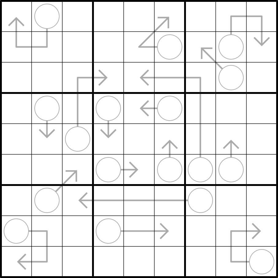 Knapp-daneben Arrows: circled digits are exactly one more or one less than the sum of digits along their arrows