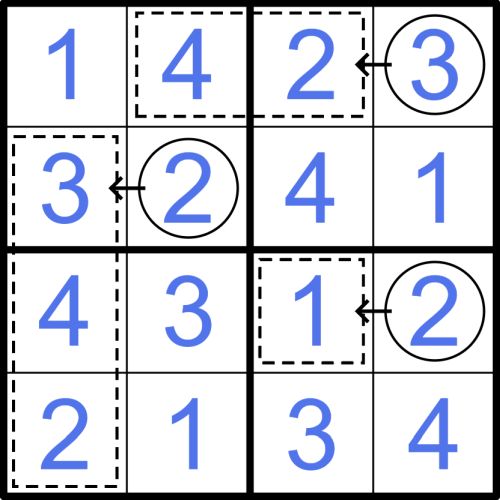 Example: The following image provides a fully solved example on a 4x4 grid. You may solve the example for yourself here on SudokuPad. Please note: Getting started with the 4x4 example is more complicated than with the regular 9x9 puzzle. Therefore, it is best to view the example primarily as an illustration of the rules and then move on to solving the 9x9 puzzle.