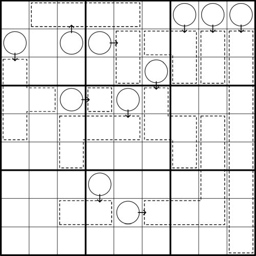 Rules: Normal Sudoku rules apply. Digits may not repeat within a cage. A cage represents a container filled with an ideal gas; its volume, V, is equal to the number of cells in the cage. A circle represents a pressure gauge; the digit in the circle is equal to the pressure, p, in the container to which it is connected by an arrow. The temperature, T, in a container is equal to the average of the digits in the container. The amount of substance, n, of the gas in a container is the same for each container. For each container independently, the ideal gas law is fulfilled such that the pressure multiplied with the volume is equal to the amount of substance multiplied with the ideal gas constant, R, and multiplied with the temperature, p V = n R T. The product n R must be determined by the solver. (You may think of this product as one global, unknown constant for the puzzle.)