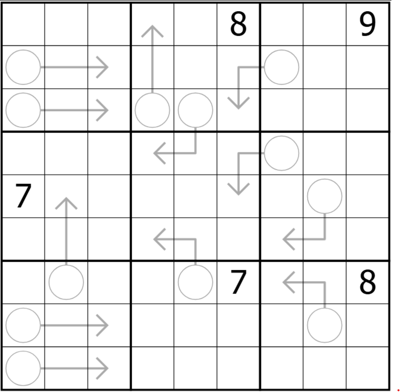 Arrow: The digits along a sudoku arrow must sum to the digit in that arrow’s circle.