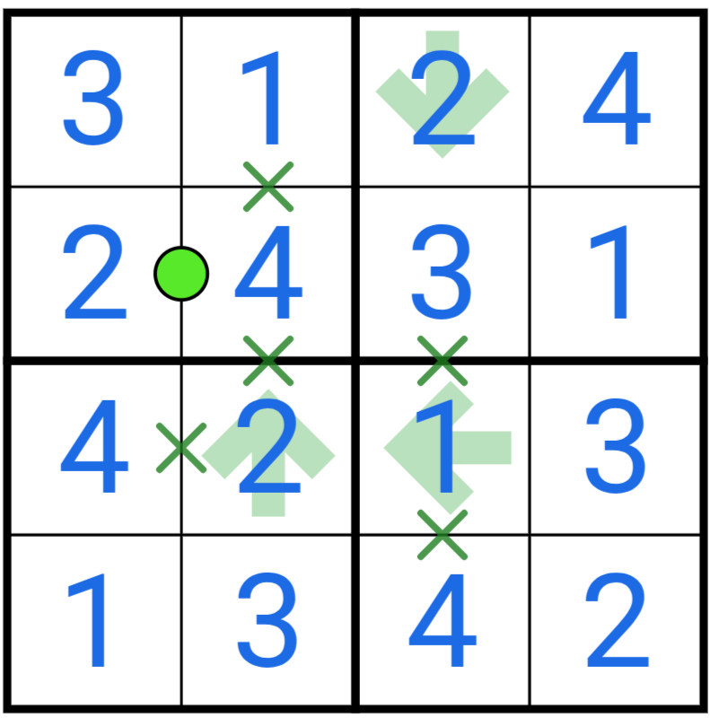 A 4x4 example with whispers that differ by 2 or more (left) and its solution (right). The counted (invisible) dots are marked with an X. Play the example.