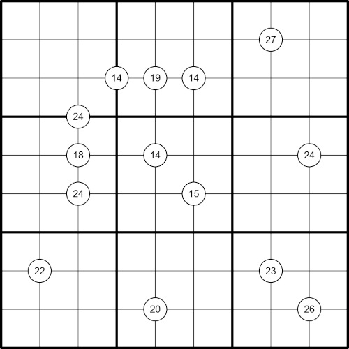 This puzzle variant is different than the more traditional one which shows the sum of pairs of diagonally opposite cells. This one is actually more similar to a killer sudoku, but the "cages" can overlap and can have repeated digits.
