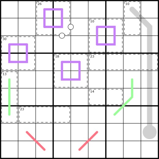 Normal Sudoku rules apply. ANTI-KING- Cells a chess king's move apart cannot have the same number. RENBAN-Numbers on purple lines are each a set of non-repeating, consecutive numbers, in any order. GERMAN WHISPERS- Numbers on green lines are at least 5 apart from their neighbors on the line. DUTCH WHISPERS- Numbers on red lines are at least 4 apart from their neighbors on the line. THERMOMETER- Numbers on the thermometer increase from the bulb end. KILLER CAGES- Numbers in cages sum to the number in the top left corner of the cage. KROPKI PAIRS- Numbers with a white dot between them are consecutive. Not all possible dots are shown.