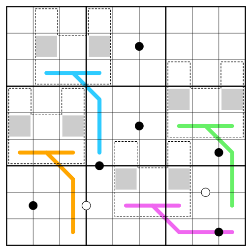 Blue lines are divided by 3x3 box borders into sums of equal value.