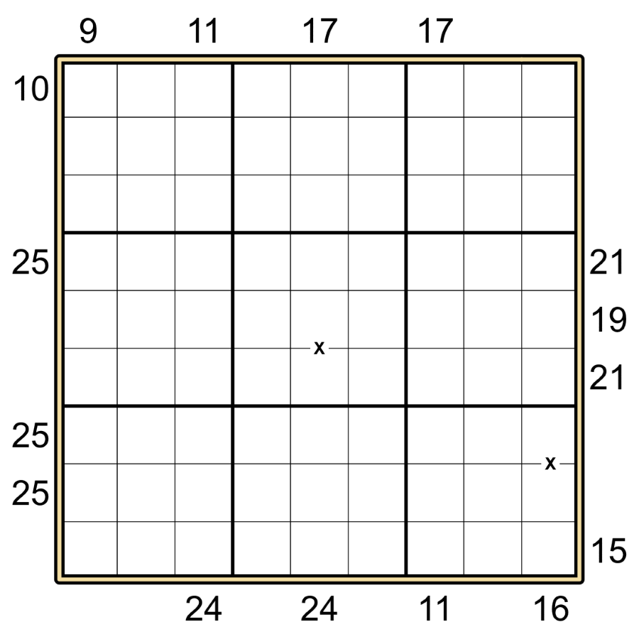 b) X-Sum: An outside clue indicates the sum of the first "X" digits where "X" is the first digit seen in that direction.