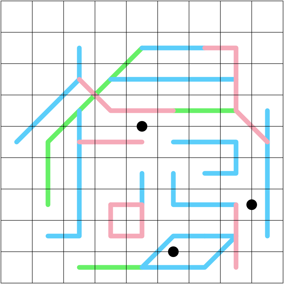 Sum Lines: On each blue line and on each pink line, the sum of shaded cells is equal to the sum of unshaded cells.