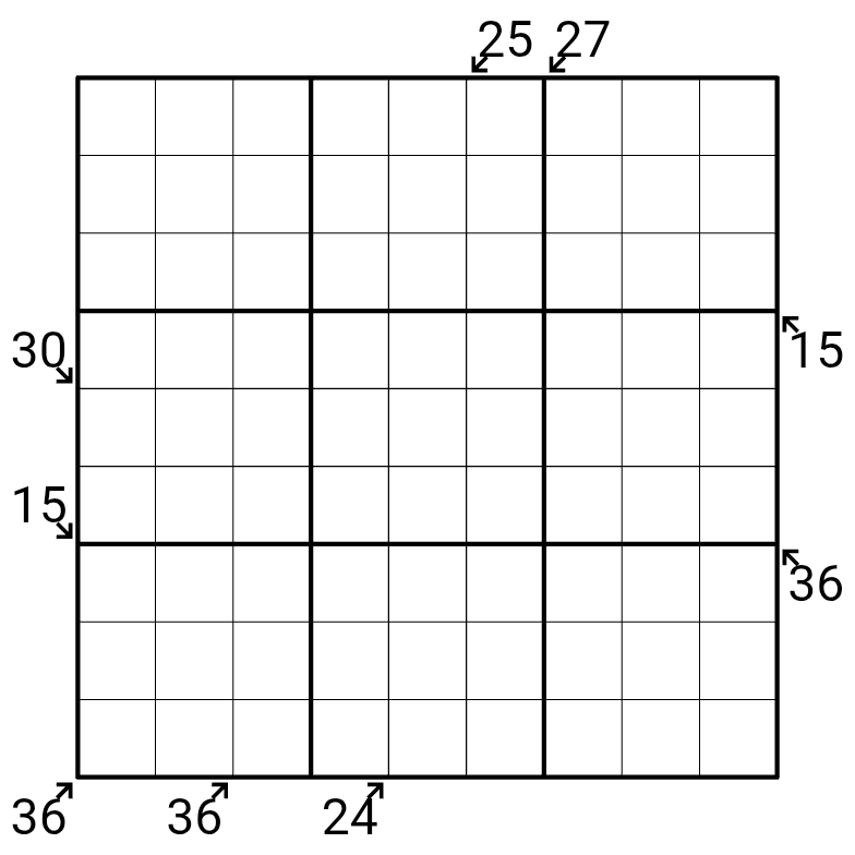 Clues outside the grid are the sum of the cells on the indicated diagonal. All digits on the indicated diagonal must also form valid Entropy lines. (Every three digits on each diagonal must include one low, medium, and high digit 123, 456, 789.)