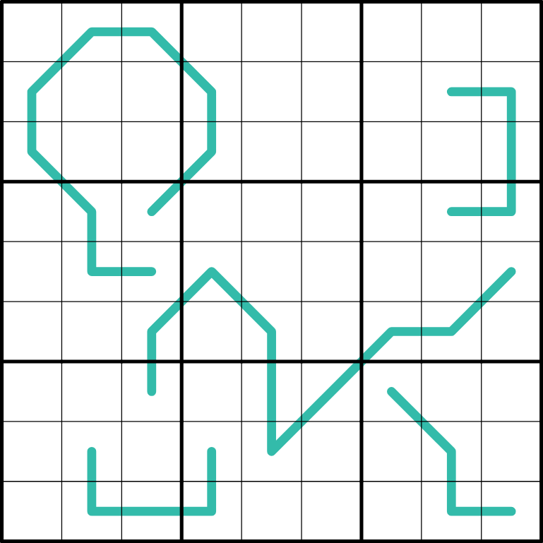 Modular lines: Any set of three sequential cells along a teal modular line contains one digit from (1,4,7), (2,5,8), and (3,6,9).