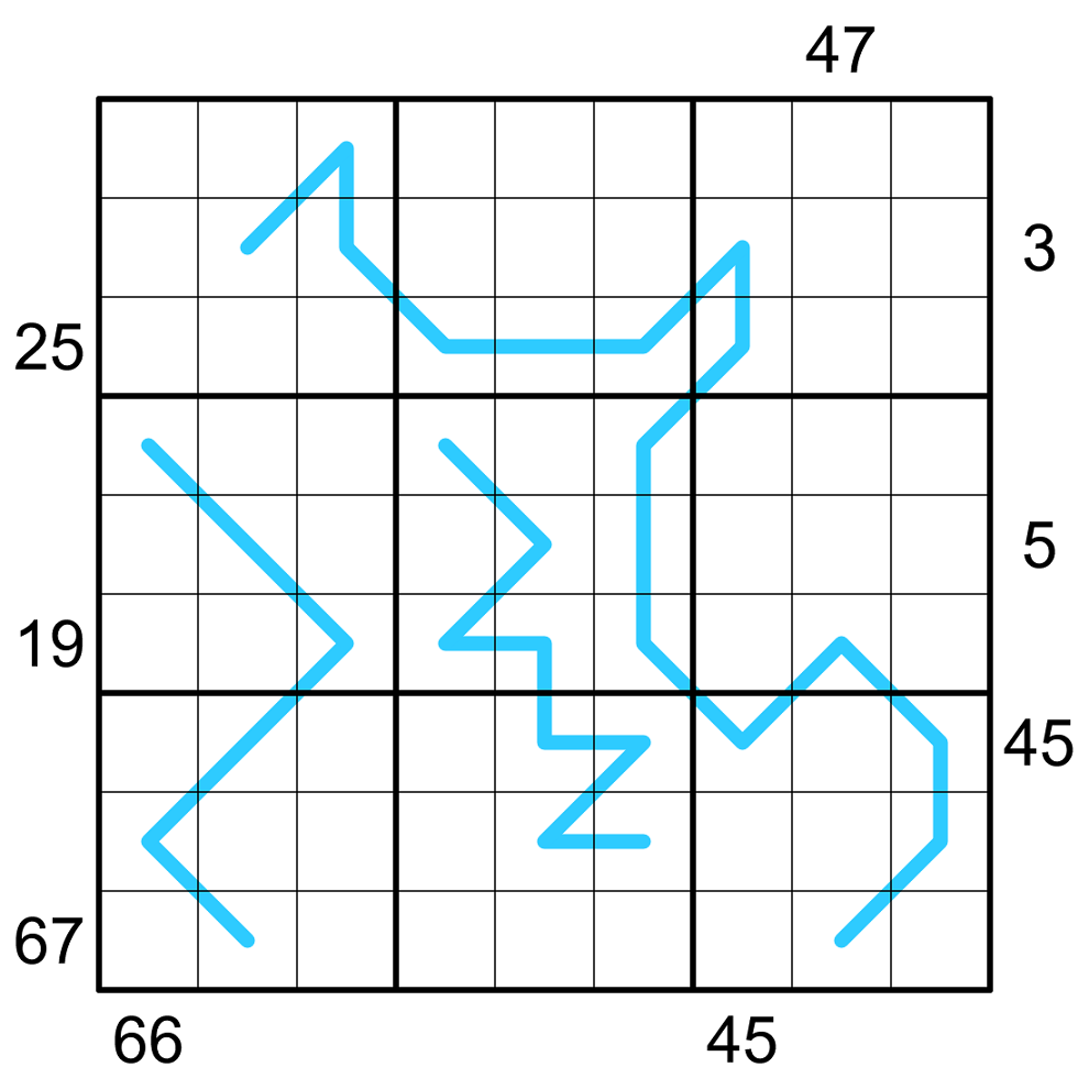 Region Sum Lines: Blue lines are split into segments by box borders. Each segment on a line sums to the same value. If a line has multiple segments in the same box, each segment is treated individually. Different lines may have different sums.