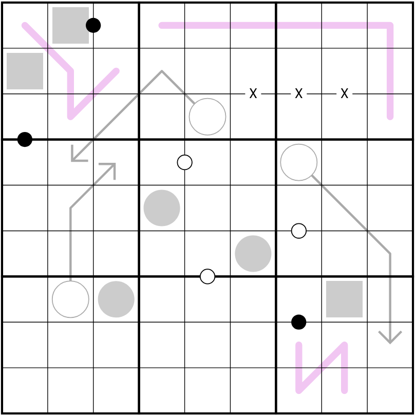 Renban: Values on a pink line form a set of consecutive numbers with no repeats.