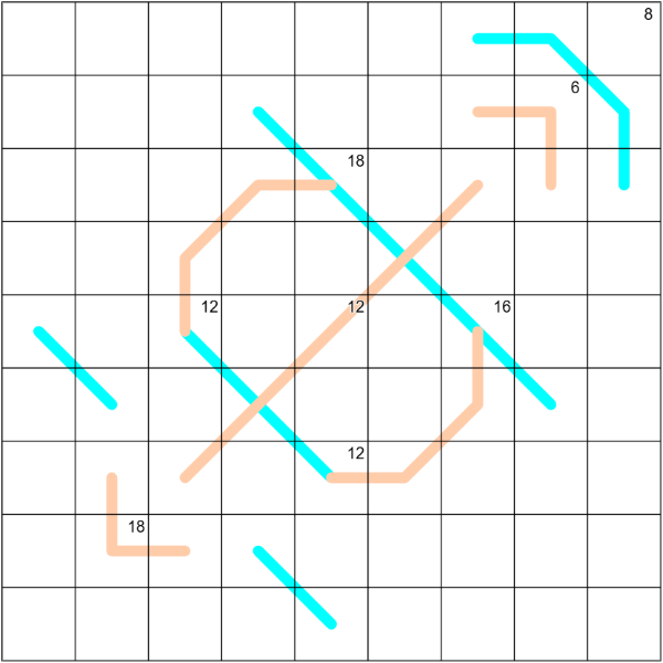 - Region borders split up blue lines into segments of the same sum. Each blue line visits at least two different regions.