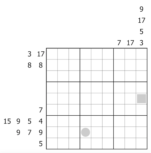 - A digit in a cell with a grey square is even. A digit in a cell with a grey circle is odd.
