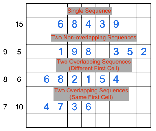 - If there are multiple clues in a row or column, the sequences of clued digits appear in the same order as the clues. Sequences fulfilled by a clue may overlap. The order of the matching clued cells is defined by the order of the first clued cell from the clue's location for each clue, unless that is the same cell, in which case it's defined by the order of the last clued cell. Eg: Clued cells R2C2-R2C7 would come before clued cells R2C3-R2C7. Clued cells R4C1-R4C5 would come before clued cells R4C1-R4C6