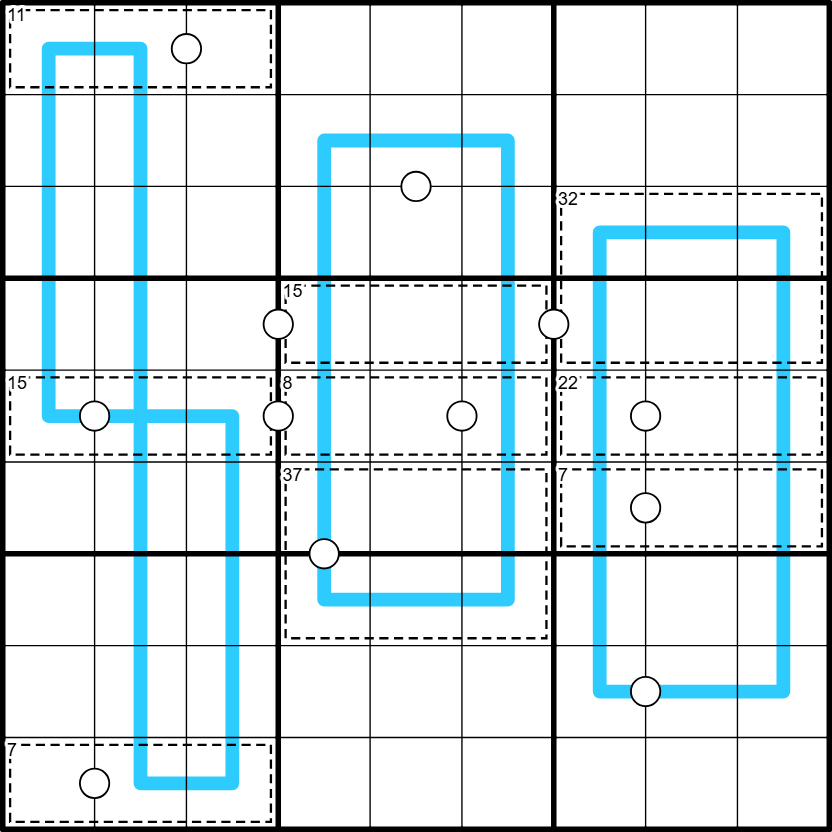 pagedo: @Plok - The Region Sum rule about distinct segments is there to clarify the Box 4 line. Boxes 5 and 6 each have two distinct segments that sum separately to the same value. There are no distinct segments in Box 4, so all the 7 cells on the line sum to a single value whch is the same as the 2 sum values of Boxes 1 and 7.