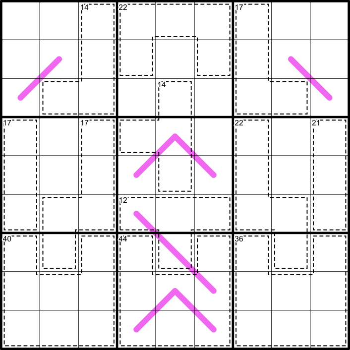 Killer: Digits in a cage must not repeat and sum to the indicated total.