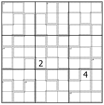 The marked cages are "Vaults". Digits in vaults MAY repeat, but must sum to the total if given. Digits orthogonally adjacent to a vault may NOT be included within that Vault.