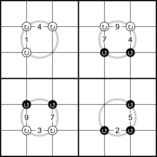 The given digits on the inside of a grey circle have to be placed in the four cells the circle touches in their same rotational positions. i.e. if you would place a 1 in R3C2, the 4 would have to be in R2C1 and if there would be a 4 in R3C2 the 1 would have to be placed in R2C3.