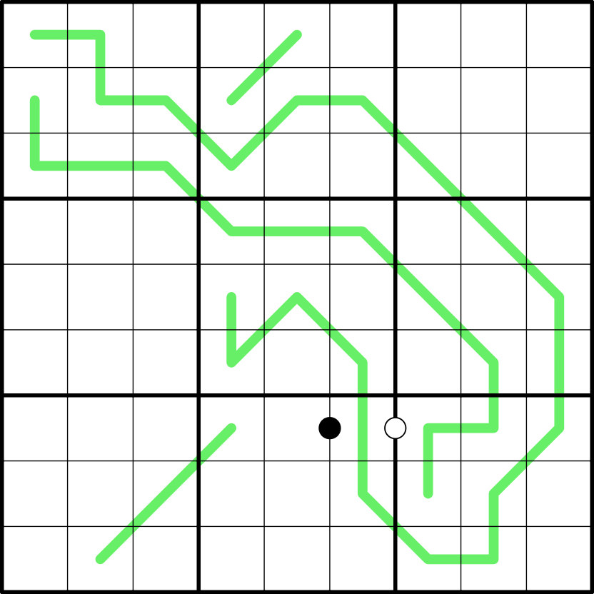 Green Lines are both German Whispers and Parity lines. Adjacent digits on the line must differ by 5 or more and must also alternate between odd and even digits.