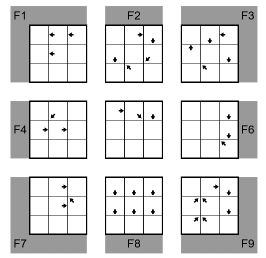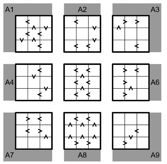 If a cell contains the digit N and has an arrow, then the digit N+1 must appear in one of the cells indicated by the arrow within the same 3x3 region (not necessarily adjacent to the arrow cell.) Not all possible arrows are shown.