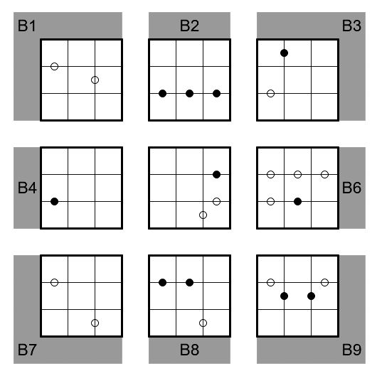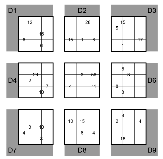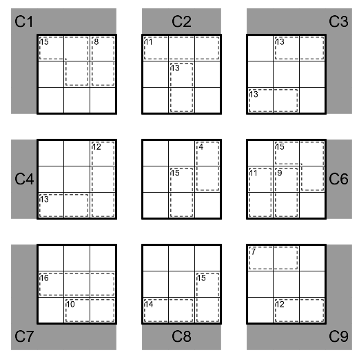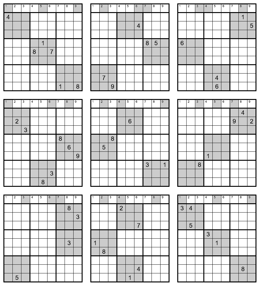 This puzzle consists of 9 incomplete Sudokus, each with numbers given in only three regions, marked with a gray background. In addition, solvers receive 54 extra patchwork pieces of 6 different types.