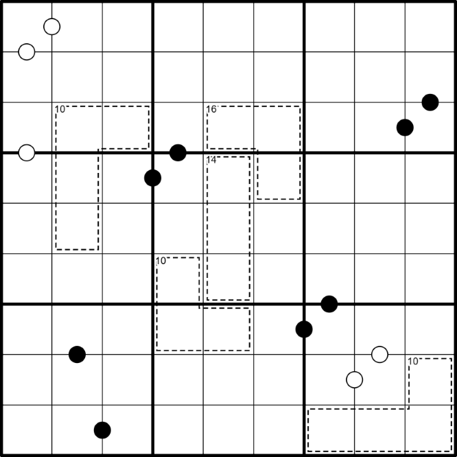 • Digits in cells separated by a black dot must be in a 2:1 ratio, digits in cells separated by a white dot must be consecutive - not all dots are shown