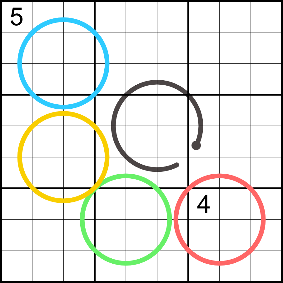 Box borders divide the blue ring (region sum line) into segments with the same sum.