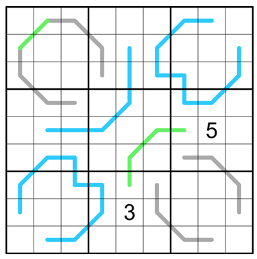 Normal sudoku rules apply. Box borders divide the blue line into segments with the same sum. Each gray line is a palindrome i.e. reads the same in both directions. Adjacent digits along the green line must differ by at least 5.