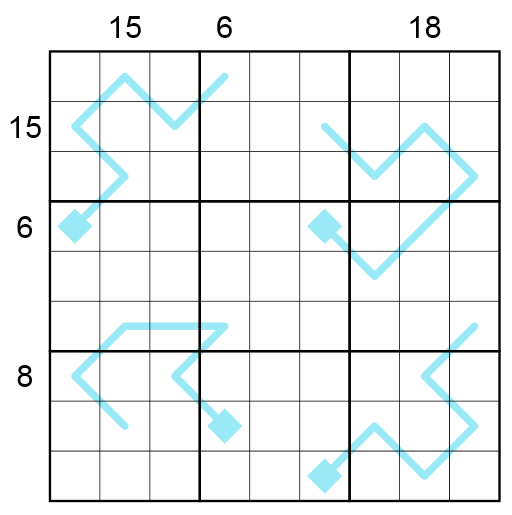 - Index Lines: Each turquoise line is an Index Line, i.e. the digit in the Nth cell along such a line (starting from the diamond) indicates the position along the line where the digit N appears. For example, if a diamond cell contains a 3, the third cell along that line must have a 1.