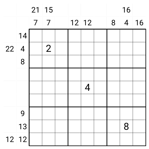 • Sandwiches: clues outside the grid give the sum between the lowest and the highest digit in that that row or column.