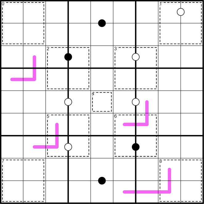 2. Kropki: White dots separate consecutive digits. Black dots separate digits where one is double the other. Not all dots are given.