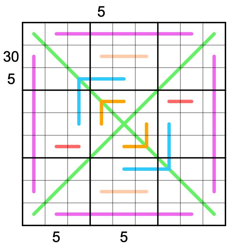 Considering it's only used once, the X-sum clue makes the rules quite a bit longer. Several clue types felt like they didn't get enough time in the spotlight and just make the rules unnecessarily long.