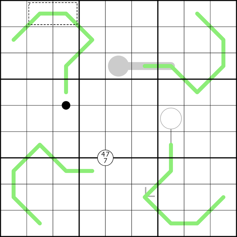 Kropki dots: Digits in cells separated by a black dot have a 1:2 ratio. Not all dots are necessarily given.