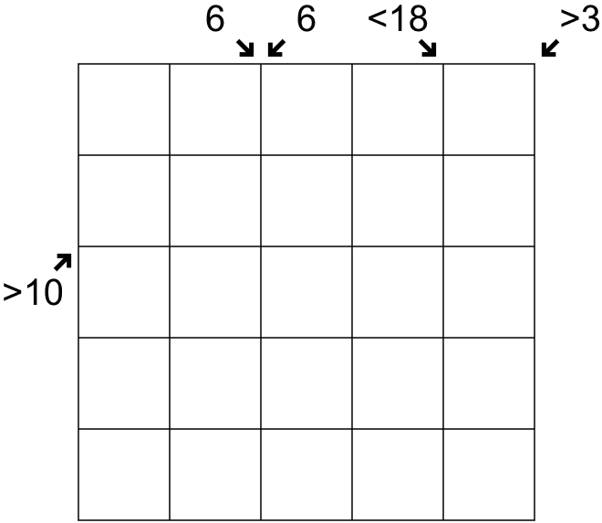 - Some clues are given as inequalities, ">" meaning "greater than" and "<" meaning "less than."