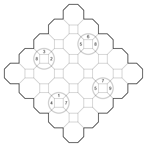 - Digits in a grey circle have to be placed in the same circular order in the four cells that are touched by the circle.