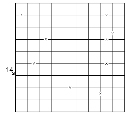 XV: Cells separated by a V sum to 5; cells separated by an X sum to 10. Not all Vs and Xs are necessarily given.