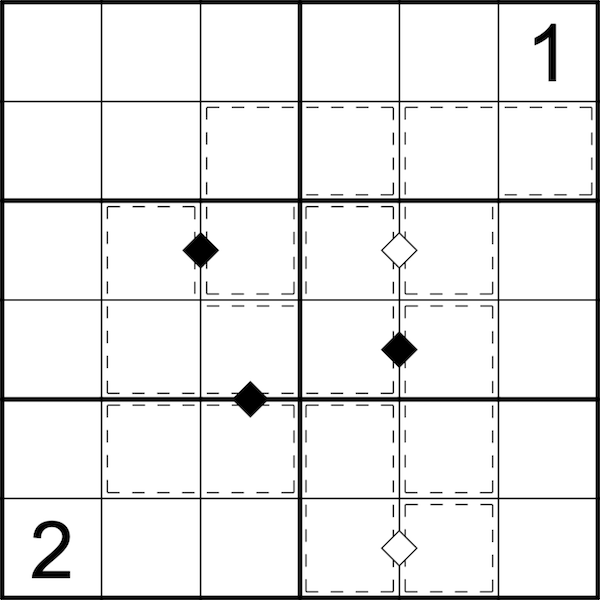 A black diamond between two cages means that the ratio between their cage totals is equal to the topmost/leftmost digit in the column/row in which that diamond appears.