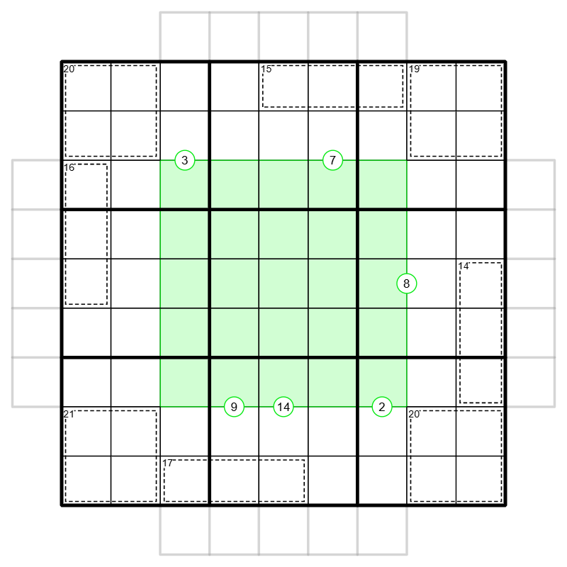 - The values on columns and rows of the inner 5x5, read in both directions, make a total of 20 numbers of 5 digits.