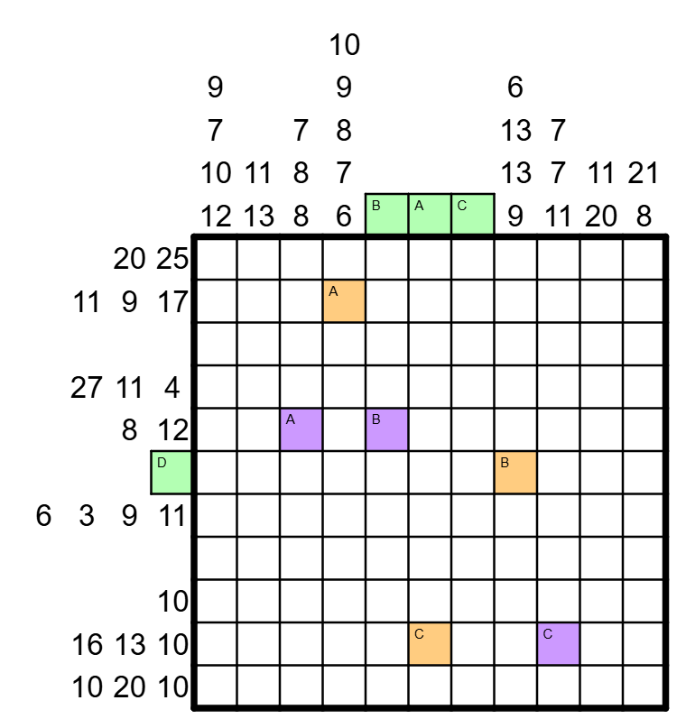 Stehen vor einer Zeile oder Spalte Hinweiszahlen, so geben diese vollständig und in der richtigen Reihenfolge die Summen von aufeinanderfolgenden Zahlen ohne Schwarzfelder dazwischen an.