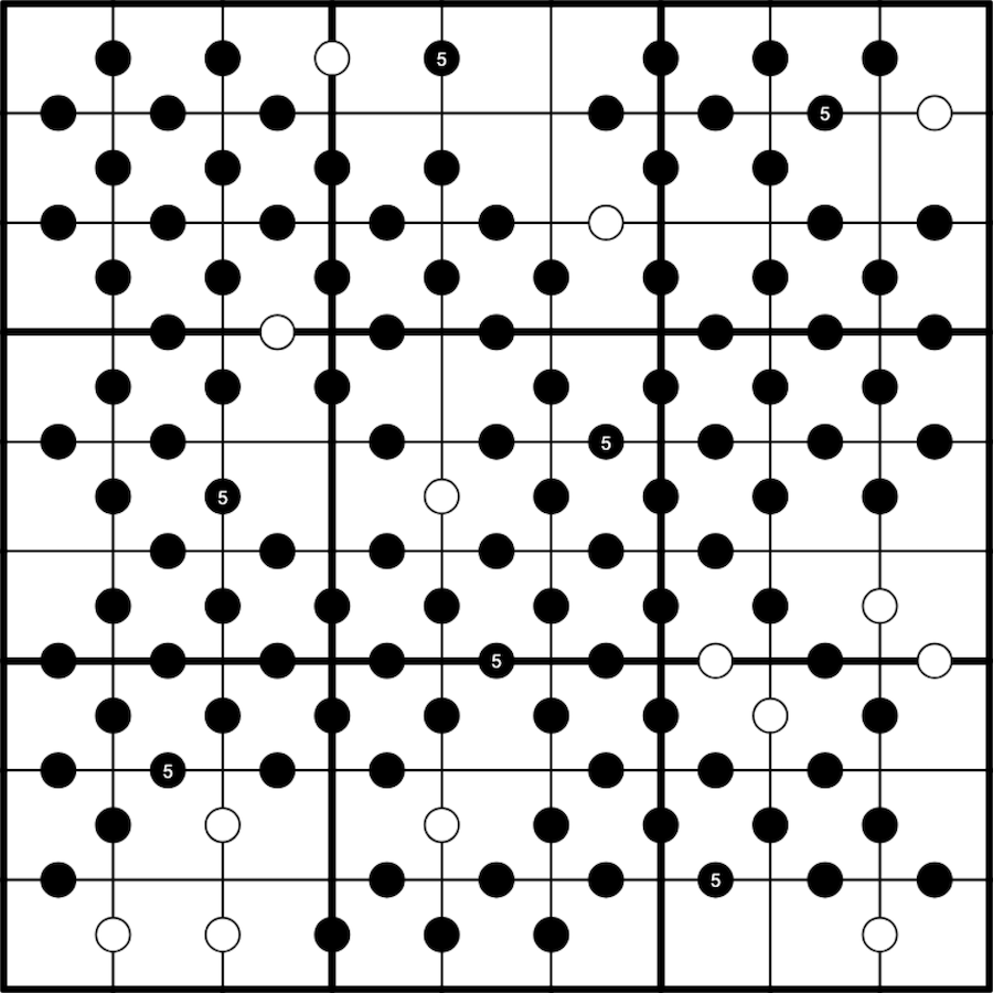 White dots mark a difference of one between adjacent digits (and use only the single digit version of the number) Not all white dots are given.