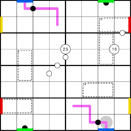 • Portals of the same colour are linked. Other puzzle elements can traverse these portals. Cells connected by a portal must have consecutive digits.