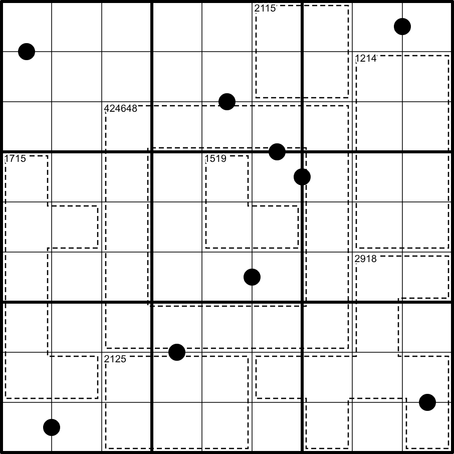 • Kropki dots: Cells joined by a black dot must have a ratio of 1:2. ALL Possible black dots are given.